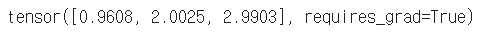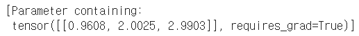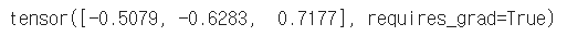 # 기울기 하강으로 최적화하기 위해 파라미터 Tensor를 난수로 초기화해서 생성 w = torch.randn(3, requires_grad=True) w |