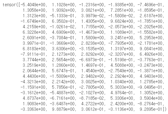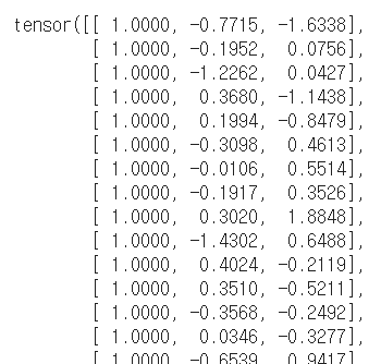 # 참(True)의 계수 w_true = torch.Tensor([1, 2, 3]) w_true |
