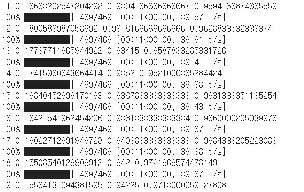 # 훈련 실행 train_net(net, train_loader, test_loader, n_iter=20, device="cuda:0") |