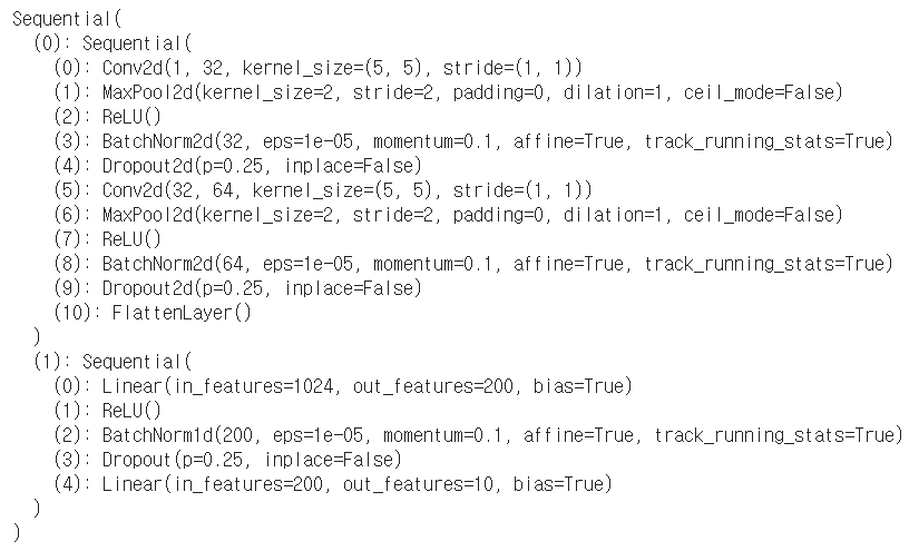# 2층 MLP mlp = nn.Sequential( nn.Linear(conv_output_size, 200), nn.ReLU(), nn.BatchNorm1d(200), nn.Dropout(0.25), nn.Linear(200, 10) ) |