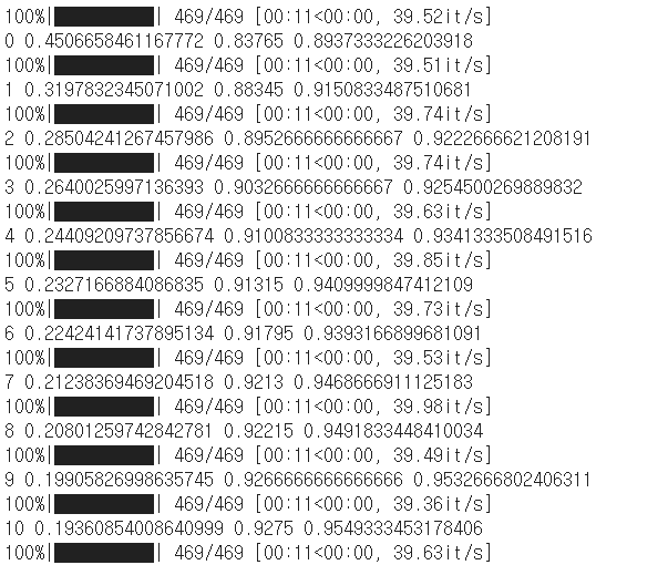 # 훈련용 헬퍼 함수 def train_net(net, train_loader, test_loader, optimizer_cls=optim.Adam, loss_fn=nn.CrossEntropyLoss(), n_iter=10, device="cpu"): train_losses = [] train_acc = [] val_acc = [] optimizer = optimizer_cls(net.parameters()) for epoch in range(n_iter): running_loss = 0.0 # 신경망을 훈련 모드로 설정 net.train() n = 0 n_acc = 0 # 시간이 많이 걸리므로 tqdm을 사용해서 진행바를 표시 for i, (xx, yy) in tqdm.tqdm(enumerate(train_loader), total = len(train_loader)): xx = xx.to(device) yy = yy.to(device) h = net(xx) loss = loss_fn(h, yy) optimizer.zero_grad() loss.backward() optimizer.step() running_loss += loss.item() n += len(xx) _, y_pred = h.max(1) n_acc += (yy == y_pred).float().sum().item() train_losses.append(running_loss / i) # 훈련 데이터의 예측 정확도 train_acc.append(n_acc / n)
