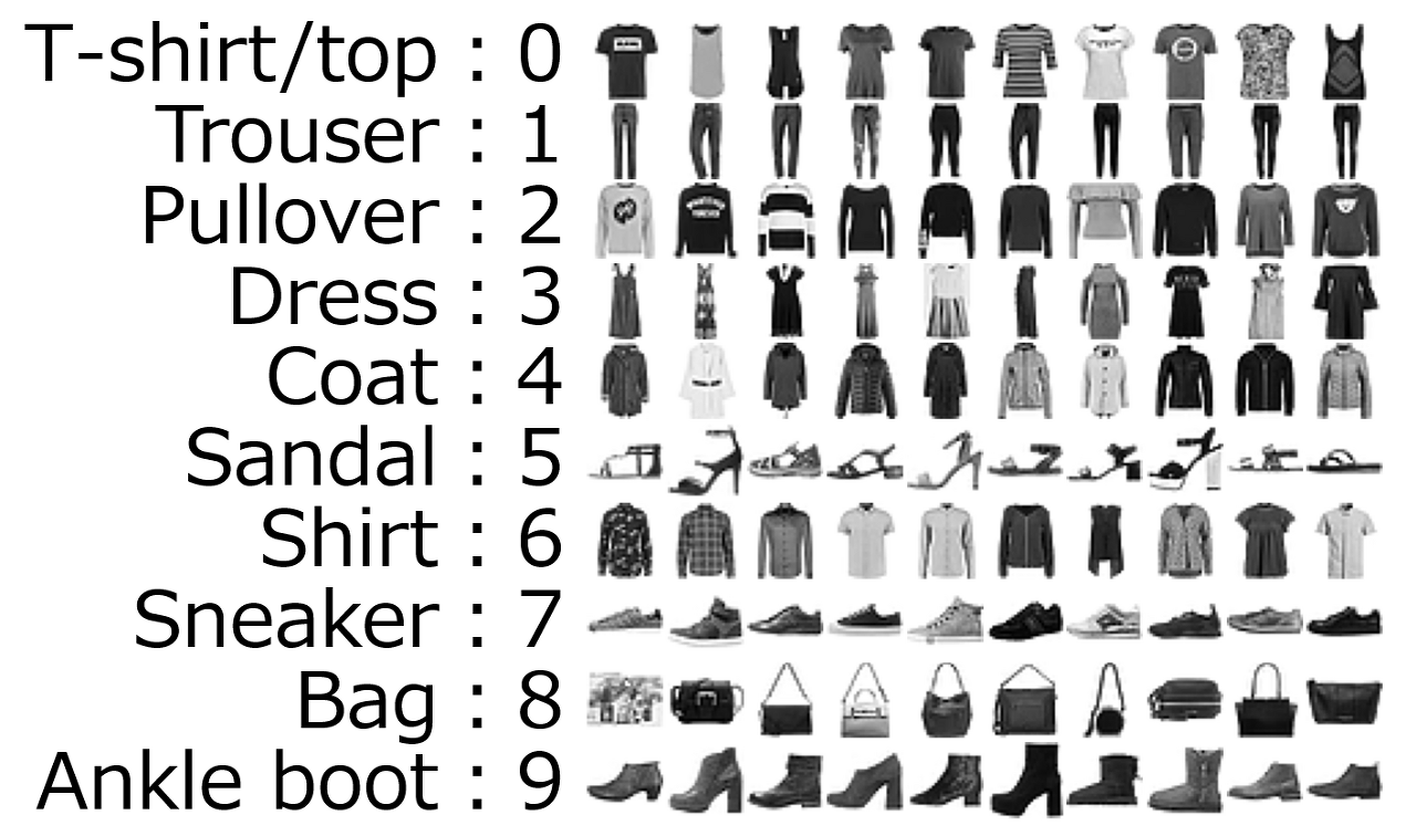 - 10가지 분류의 옷 및 액세서리(신발, 구두 등)를 이미지 데이터