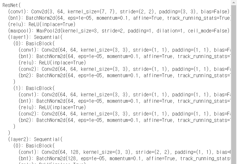 # 사전 학습이 완료된 resnet18 불러오기 net = models.resnet18(pretrained=True) |