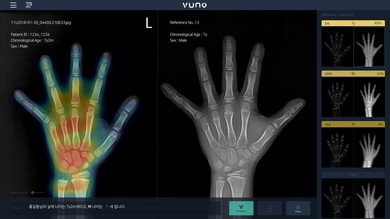 - 손의 X-ray 영상으로 뼈 나이(골 연령·Bone age) 측정. 결과에 따라 생활습관 개선이나 호르몬 치료 등을 도움