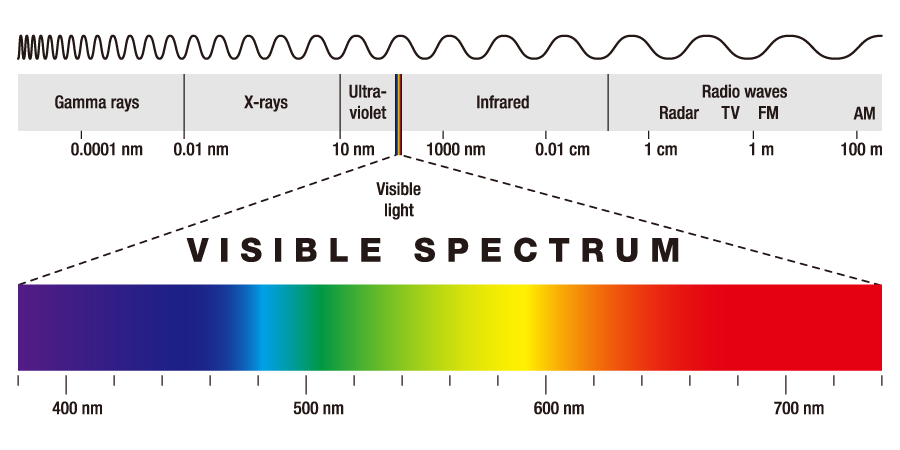 위의 그림은 빛의 파장 영역대이다. CCD, CMOS 센서와 사람의 눈으로 볼 수 있는건 가시광선 영역대(400nm~700nm)이다. 광원과 광원을 받아들이는 센서를 바꾸면 다양한 영역대의 빛을 확인 할 수 있다. 예를 들어 광원에서 자외선 내보내고 자외선 센서로 빛을 받아들이면 자외선 시스템이 만들어 지는 것이다. 위의 그림에서 확인할 수 있듯이 왼쪽으로 갈수록 파장이 짧아지는데 파장이 짧을수록 에너지가 크며 인체에 유해하다(X-rays, Gamma rays).