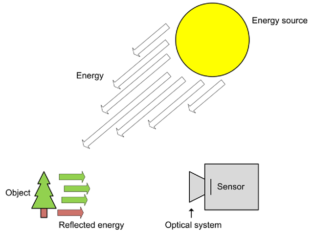광원에서 나온 빛이 물체에 닿게 되면 특정 빛이 반사된다. 이 반사된 빛을 센서를 통해 취득하면 영상으로 만들어 진다. 보통 카메라에서는 CCD, CMOS 센서를 사용하는데 가시광선을 전기 신호로 바꿔주는 역할을 한다. 전기신호의 명암차이로 색깔차이를 표현해준다.