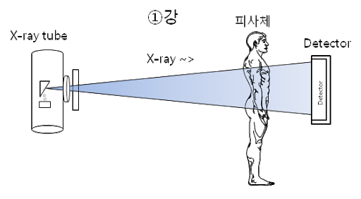 X-ray tube (광원)에서 X-ray를 피사체에 쏘면 X-ray의 에너지가 높기 때문에 피사체를 통과하게 된다. 통과된 신호를 Detector에서 받아들인다. X-ray가 몸에 있는 tissue(공기, 뼈, 근육 등)를 통과하면 tissue의 intensity(강도)에 따라 통과된 에너지가 달라진다. Detector는 피사체를 통과해서 받은 X-ray를 전기 신호로 바꾸어 영상을 만들어낸다.