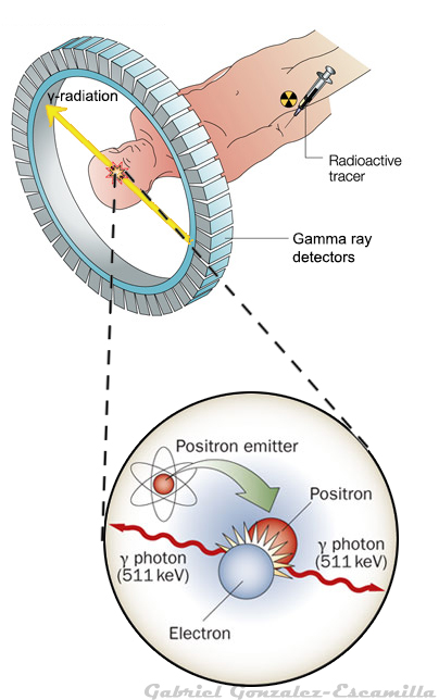 몸에 주입하는 방사선 물질은 양전자를 방출하는 방사성 동위원소를 결합한 의약품이다. 양전자 방출 단층 촬영기를 이용하여 이를 추적하여 체내 분포를 알아본다. 가장 흔히 이용하는 방사성 의약품은 포도당과 유사한 물질이여서 포도당의 대사가 활발한 곳에서 방출이 많이 이루어진다. 주입한 물질은 빨리 분해가 되야하므로 반감기가 짧은 방사선 물질을 만드는데 이것을 사이클로트론이라고 한다. 반감기가 짧은 원소들은 양전자를 방출하는데 양전자가 몸안의 전자들을 만나면 소멸이 일어나면서 γ-ray(Gamma ray)가 만들어진다. γ-ray가 양방향으로 방출될때 양방향에 있는 Detector에서 신호를 수집하여 CT와 같은 방식으로 영상을 취득할 수 있다. 또한 포도당 대사는 암세포가 있는 곳에서 비정상적으로 대사가 활발히 일어난다. 따라서 PET 영상에서는 암세포가 있는 부위가 밝에 나타나는 경향이 있다. 암을 조기진단 하는데 유용하게 사용된다.