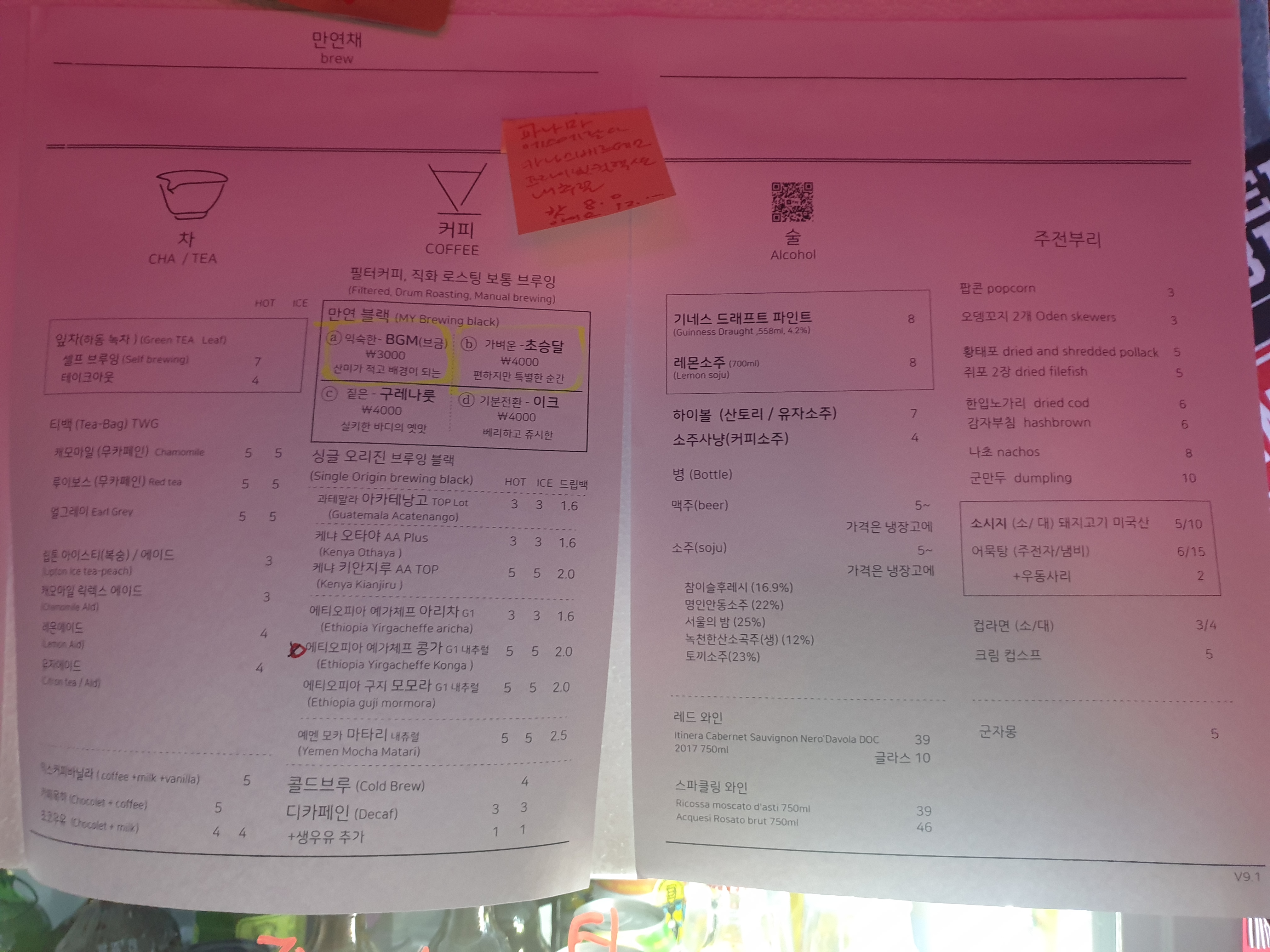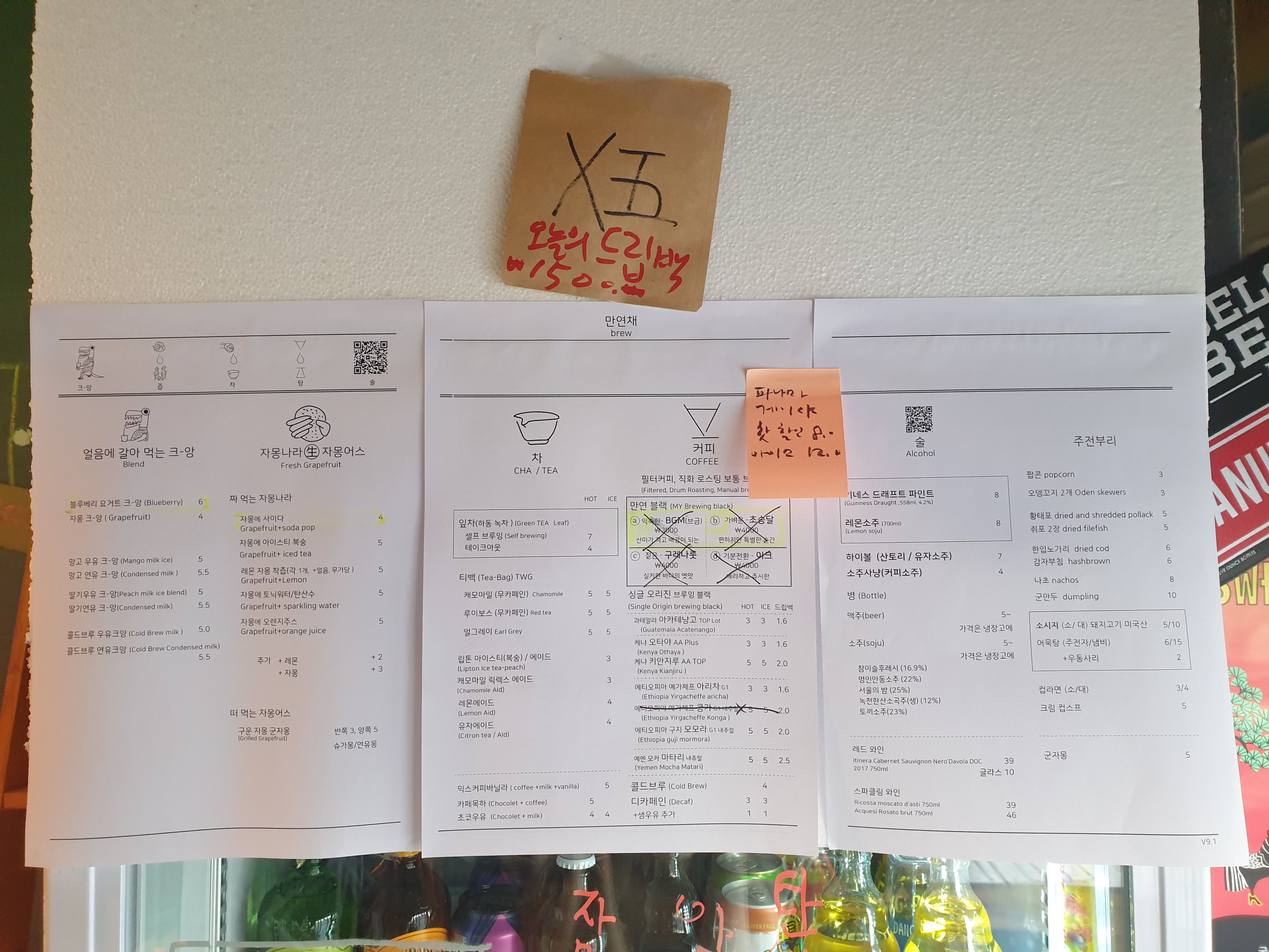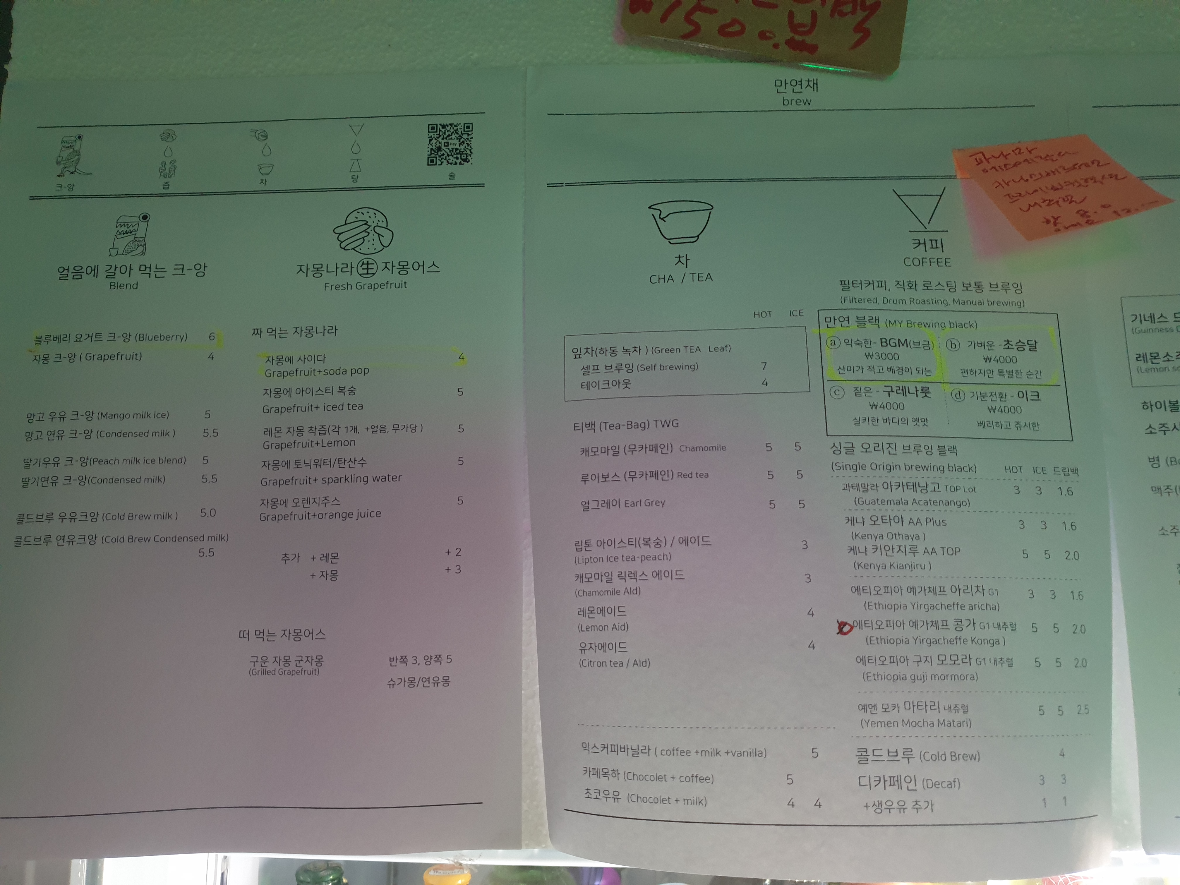 만연채의 메뉴판 입니다. 브루잉 커피를 저렴한 가격에 마실 수 있어서 좋습니다. 드립백도 파는데 향이 너무 좋아서 한참을 맡게 됩니다. 개인적으로 초승달을 추천합니다. (이름의 뜻을 알고 나면 더욱 맛있습니다.)