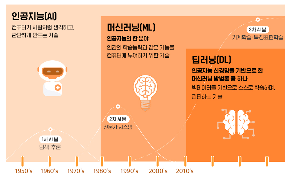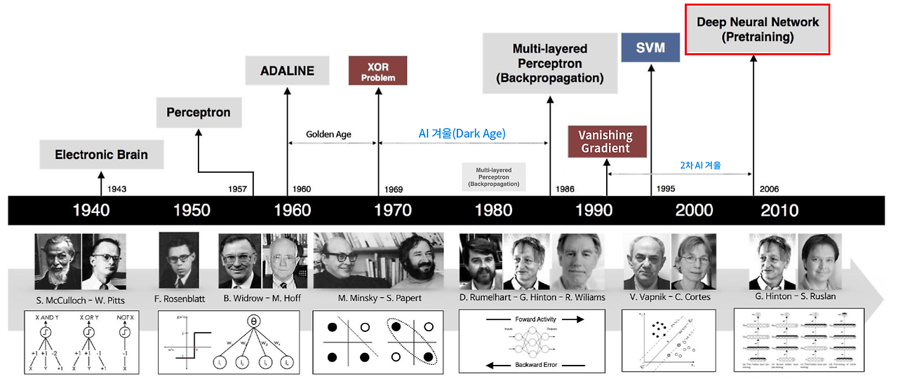 - 2006년: 딥러닝 기법이 개발되기 시작함. 뉴럴 네트워크 기반의 연구에 빅데이터가 적용됨
