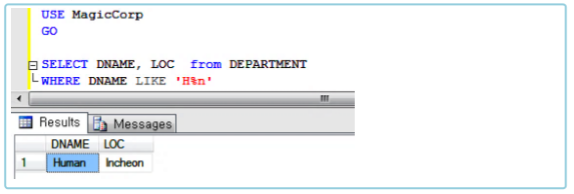 예) 부서 테이블에서 부서명(DNAME)이 H로 시작하고 n으로 끝나는 부서의 위치(Loc) 검색