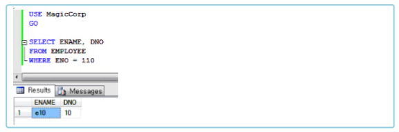 예) 사원 테이블(EMPLOYEE)에서 사원번호(ENO) 110번의 이름(ENAME)과 부서번호(DNO) 검색