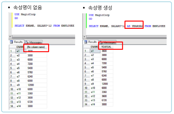 예) 사원 테이블에서 사원명과 봉급*12 검색