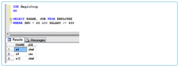 예) 사원 테이블에서 부서번호(DNO)가 20번이고 봉급(SALARY)이 400이상인 사원의 이름(ENAME)과 직책(JOB) 검색
