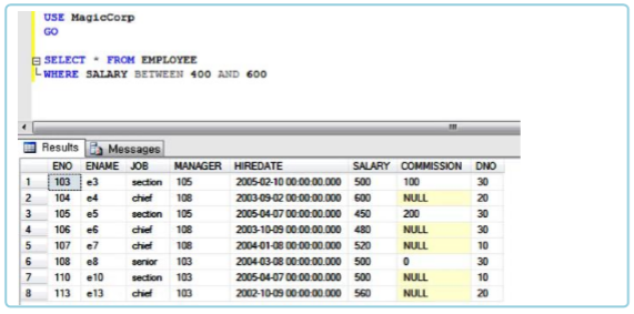예) 사원 테이블에서 봉급이 400보다 크거나 같고 600보다는 작거나 같은 사원들의 정보 검색