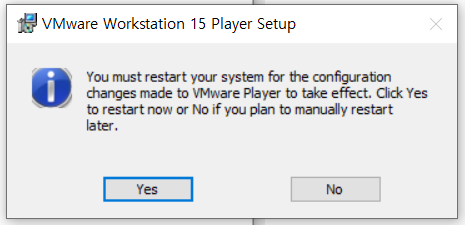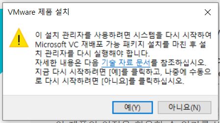 VMware를 설치전에 한번 시스텡을 재시작해야 하는데 바로 재시작 하실분은 예를 누르시고