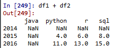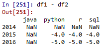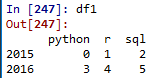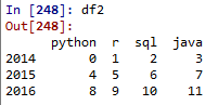 df2 = DataFrame(np.arange(12).reshape(3,4), index=['2014','2015','2016'], columns = ['python','r','sql','java']) |