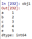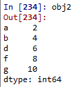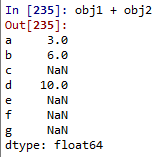 | obj1 = Series([1,2,3,4,5], index=['a','b','c','d','e']) | obj2 = Series([2,4,6,8,10], index=['a','b','d','f','g']) |
