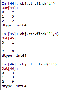 # 오른쪽부터 글자를 검색한 후 인덱스 번호를 리턴(없으면 -1) obj.str.rfind('l') |