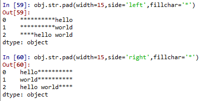 # 빈 부분에 문자값 채우기obj.str.pad(width=15,side='left',fillchar='*') # 왼쪽obj.str.pad(width=15,side='right',fillchar='*') # 오른쪽 |
