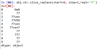 # 인덱스 사이값을 다른 값으로 대체obj.str.slice_replace(start=0, stop=2,repl='77') |