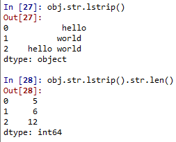 # 왼쪽 공백 제거 # 왼쪽 공백 제거 한뒤 문자 길이 obj.str.lstrip().str.len() |